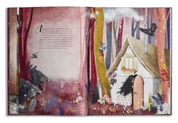 «Y como, mientras hacía su labor, de vez en cuando miraba caer la nevada, la reina se pinchó un dedo con la aguja, y tres gotas de sangre fueron a manchar la nieve. Al ver el hermoso efecto del rojo destacando sobre el blanco manto, pensó: «¡Ojalá tuviera yo una hijita que fuera blanca como la nieve, roja como la sangre y negra como el ébano»