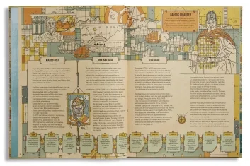 El libro, con elegantes ilustraciones teseladas y geométricas, contiene mapas de los trayectos de cada expedición. Además, los relatos y las biografías se complementan con una línea del tiempo que vincula esas gestas con otras realizadas en tiempos modernos. Como complemento, se cierra con un glosario de términos y lugares relevantes de los distintos viajes.