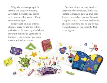 "A casa de Lluc fa poc que ha arribat un marcià, i sembla que ha vingut per a quedar-s’hi. Això és el que li han dit. El marcià no sap fer res a soles, li han de donar el menjar, l’han de banyar i moltes altres coses. Lluc comparteix habitació amb ell i, per si de cas, també ha aprés a tenir-ne cura, tot i que no està molt convençut que siga una bona idea conviure amb un marcià.