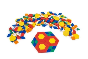 Conjunto de formas geométricas realizadas en plástico irrompible de 6 colores diferentes. Se puede utilizar en seriaciones y clasificaciones, y también como piezas para composición de mosaicos.