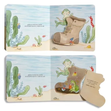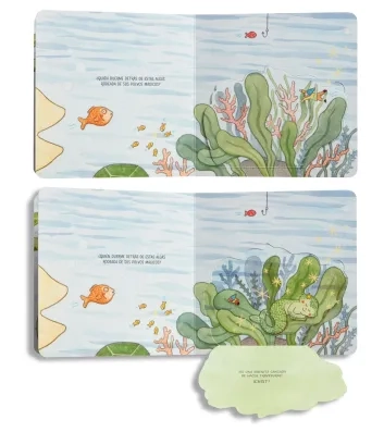 Los pequeños y pequeñas descubrirán que bajo el agua se camuflan increíbles personajes: una tortuga lectora, un salmón con la tripa muy llena, una sirena descansando… ¿Quién chapotea en la orilla tras los altos juntos? ¡Pueden levantar las solapas para descubrirlo!